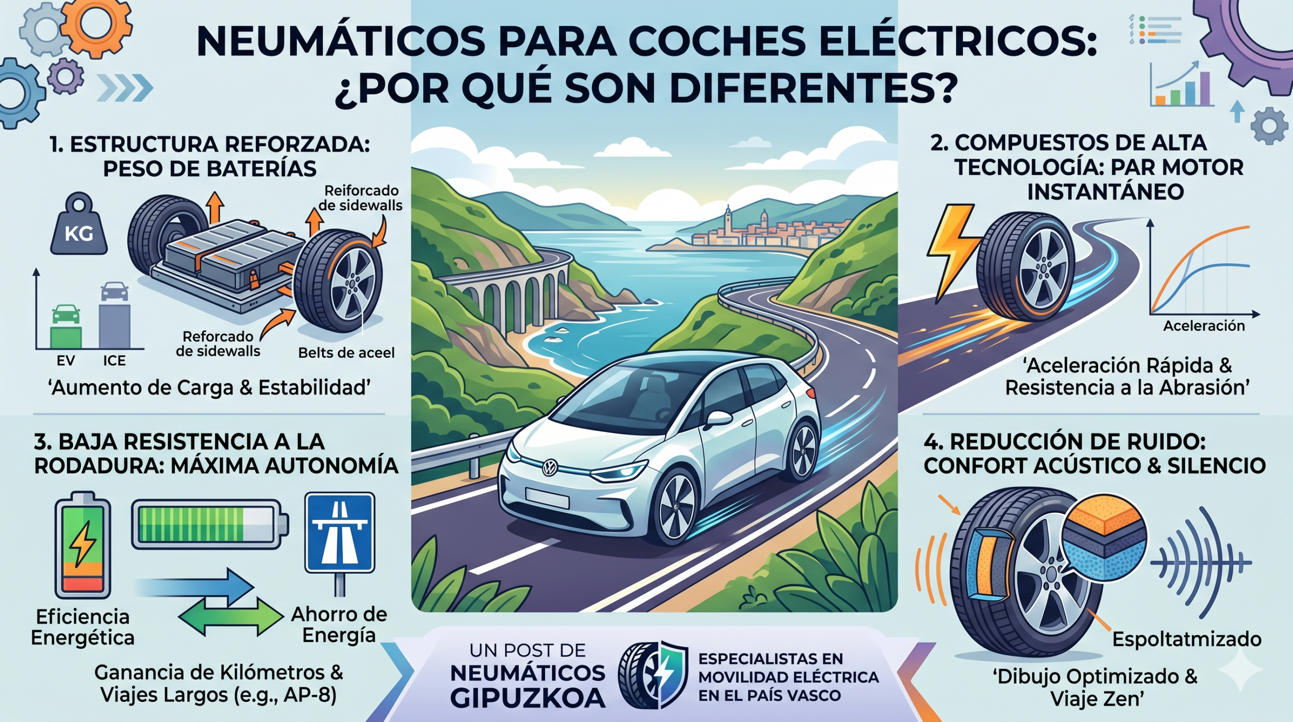 Desde Neumáticos Gipuzkoa, la respuesta es clara: los coches eléctricos (EV) tienen exigencias técnicas muy distintas a los de combustión interna. Montar una rueda convencional en un eléctrico no solo acortará la vida del neumático, sino que perjudicará la autonomía y la seguridad. En este artículo te explicamos los cuatro factores clave que marcan la diferencia.